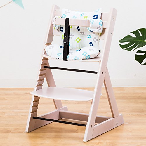 【人気ベビーチェア 笑顔のマジカルチェアー+専用クッション (お得2点セット)】 木製椅子 安心強度の三角形ベース 高さ調節可能 ふかふかクッションセット (チェア:ホワイトウォッシュ色 クッション:花柄ブルー)