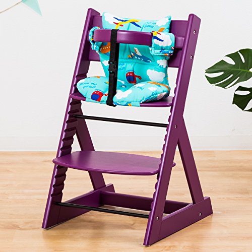 【ベビーチェア ハイチェア 高さ調節 木製 専用クッション付き】こどもと一緒に成長するチェア 高さ調節可能! 安全ベルト付き ふかふかクッションセット チェア色:パープル クッション色/柄:飛行機