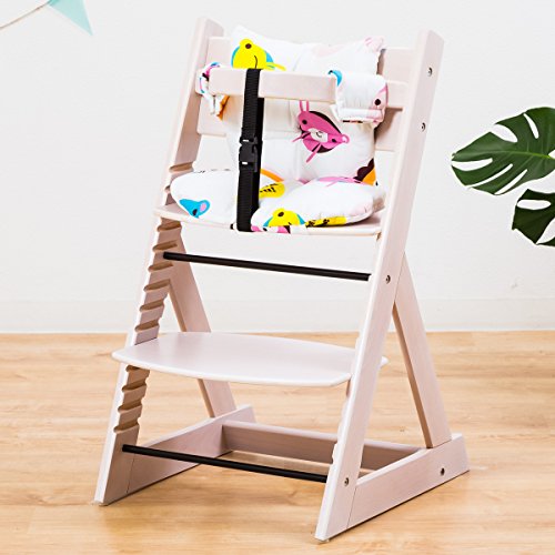 【人気ベビーチェア 笑顔のマジカルチェアー+専用クッション (お得2点セット)】 木製椅子 安心強度の三角形ベース 高さ調節可能 ふかふかクッションセット (チェア:ホワイトウォッシュ色 クッション:アニマルピンク)