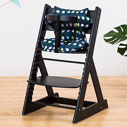 【人気ベビーチェア 笑顔のマジカルチェアー+専用クッション (お得2点セット)】 木製椅子 安心強度の三角形ベース 高さ調節可能 ふかふかクッションセット (チェア:ブラック色 クッション:大水玉ネイビー)