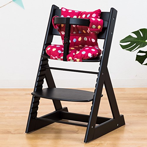 【人気ベビーチェア 笑顔のマジカルチェアー+専用クッション (お得2点セット)】 木製椅子 安心強度の三角形ベース 高さ調節可能 ふかふかクッションセット (チェア:ブラック色 クッション:大水玉レッド)