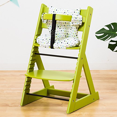 【人気ベビーチェア 笑顔のマジカルチェアー+専用クッション (お得2点セット)】 木製椅子 安心強度の三角形ベース 高さ調節可能 ふかふかクッションセット (チェア:グリーン色 クッション:小水玉ブルー)