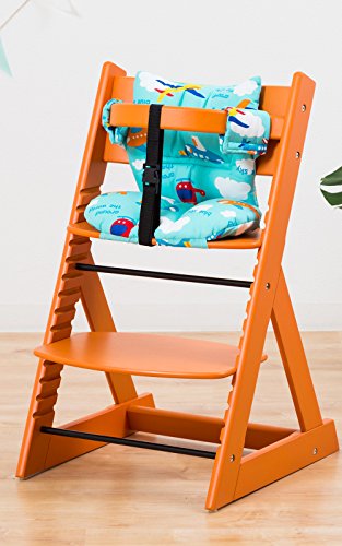 【人気ベビーチェア 笑顔のマジカルチェアー+専用クッション (お得2点セット)】 木製椅子 安心強度の三角形ベース 高さ調節可能 ふかふかクッションセット (チェア:オレンジ色 クッション:飛行機柄)