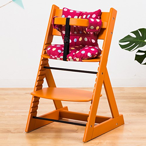 【ベビーチェア ハイチェア 高さ調節 木製 専用クッション付き】こどもと一緒に成長するチェア 高さ調節可能! 安全ベルト付き ふかふかクッションセット チェア色:オレンジ クッション色/柄:大水玉レッド