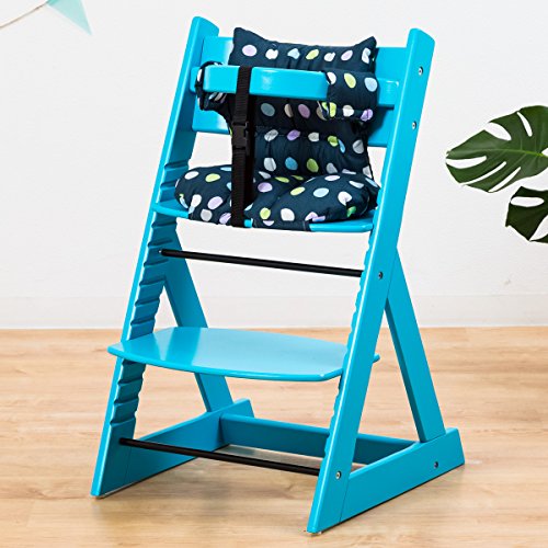 【人気ベビーチェア 笑顔のマジカルチェアー+専用クッション (お得2点セット)】 木製椅子 安心強度の三角形ベース 高さ調節可能 ふかふかクッションセット (チェア:ブルー色 クッション:大水玉ネイビー)