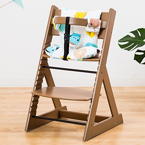 【人気ベビーチェア 笑顔のマジカルチェアー+専用クッション (お得2点セット)】 木製椅子 安心強度の三角形ベース 高さ調節可能 ふかふかクッションセット (チェア:ブラウン色 クッション:アニマルブルー)
