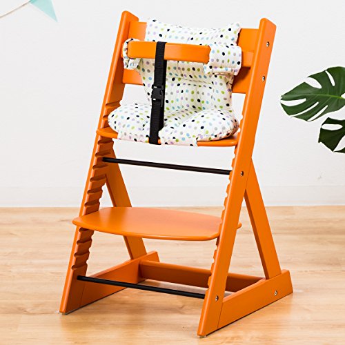 【ベビーチェア ハイチェア 高さ調節 木製 専用クッション付き】こどもと一緒に成長するチェア 高さ調節可能! 安全ベルト付き ふかふかクッションセット チェア色:オレンジ クッション色/柄:小水玉ブルー