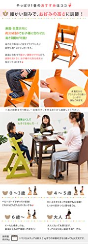 [Point-1] 高さ調整 :ダイニングの高さとお子様の成長に合わせて調節できるから、お子様と近い目線で向き合ってお食事ができます。座面・足置き共に3cm刻みでの調節が可能。成長と共に長く付き合えるチェアです。