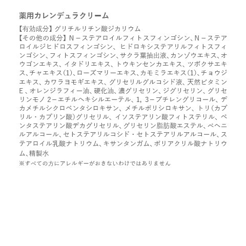 全成分 : グリチルリチン酸ジカリウム、ヒアルロン酸ナトリウム(2)、N-ステアロイルフィトスフィンゴシン、N-ステアロイルジヒドロスフィンゴシン、ヒドロキシステアリルフィトスフィンゴシン、フィトスフィンゴシン、タイムエキス(1)、マヨラナエキス、ニンジンエキス、トウキンセンカエキス、オレンジラフィー油、水素添加大豆リン脂質、ワセリン、1,3-プロパンジオール、1,3-ブチレングリコール、ジグリセリン、1,2-ペンタンジオール、1,2-ヘキサンジオール、パルミチン酸2-エチルヘキシル、パルミチン酸セチル、テトラオレイン酸ポリオキシエチレンソルビット、フィトステロール、ステアリルアルコール、ベヘニルアルコール、自己乳化型モノステアリン酸グリセリル、ペンタステアリン酸デカグリセリル、ステアロイル乳酸ナトリウム、アクリル酸・メタクリル酸アルキル共重合体、水酸化カリウム、ジエチレントリアミン五酢酸五ナトリウム液、精製水 - <メルシーケア 薬用カレンデュラクリーム> 75g