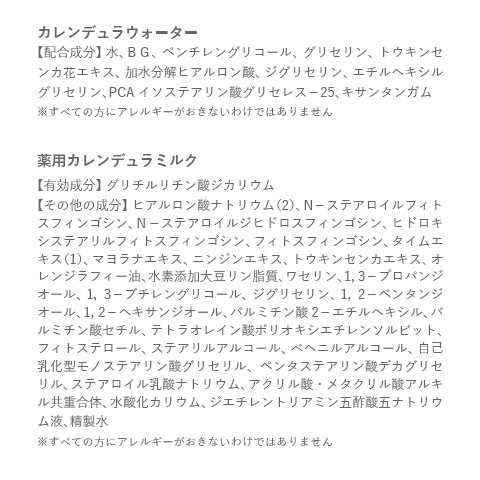 全成分 : 水、BG、ペンチレングリコール、グリセリン、トウキンセンカ花エキス、加水分解ヒアルロン酸、ジグリセリン、エチルヘキシルグリセリン、PCAイソステアリン酸グリセレス-25、キサンタンガム - <メルシーケア 薬用カレンデュラミルク> 150mL