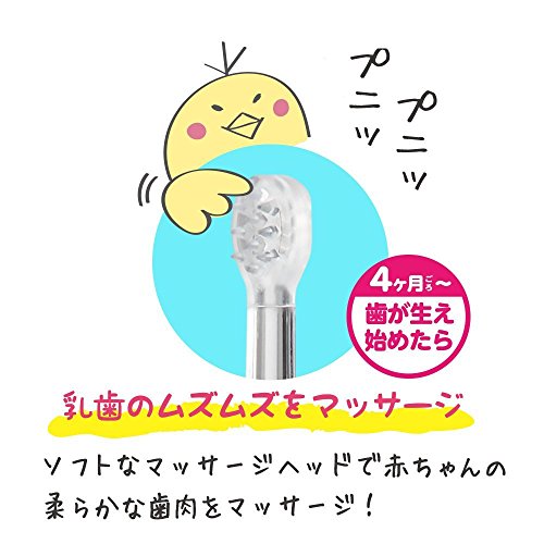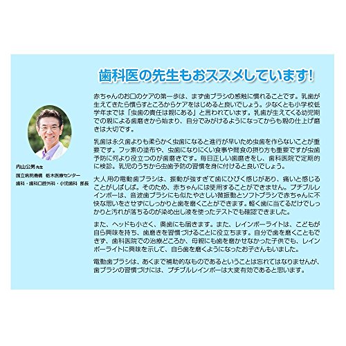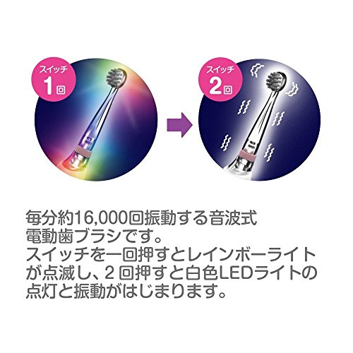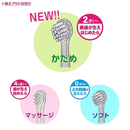 生後4ケ月ごろから使用できるこども用電動歯ブラシ。 乳歯のムズムズをマッサージできるマッサージヘッド付。 傷つきやすいに乳歯にやさしい超やわらか毛のブラシ付。 2種のLEDライトで楽しく歯磨き。レインボーライトは楽しく、白色LEDライトは仕上げの時にお口の中がよく見えます。 1分間に16,000回の音波振動で、軽く当てるだけで磨けます。 「ブルッとタイマー」付。30秒ごとにブルっと合図して、しっかり磨いたかの目安になります。 こどもの小さな口にぴったりな小型ヘッド 安心の自動停止(レインボー30秒、白色LED&振動2分)