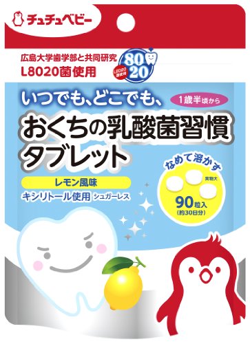 [チュチュベビー L8020菌使用 おくちの乳酸菌習慣タブレット レモン風味 90粒入 約30日分]は、乳酸菌L8020菌を使用したタブレットです。お口を健康に保ち口内環境を整えます。奥歯が生えてくる1歳半頃から食べられます。ママやプレママにもおすすめです。