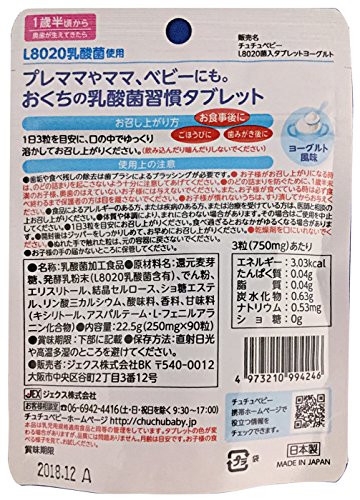 [チュチュベビー L8020菌使用 おくちの乳酸菌習慣タブレット ヨーグルト風味 90粒入 約30日分]は、乳酸菌L8020菌を使用したタブレットです。お口を健康に保ち口内環境を整えます。奥歯が生えてくる1歳半頃から食べられます。ママやプレママにもおすすめです。