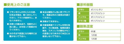 - 材質 : ブラシ:ポリウレタン(耐熱温度80度)、柄:ポリプロピレン(耐熱温度120度)、ハンドル:ポリプロピレン(耐熱温度120度)