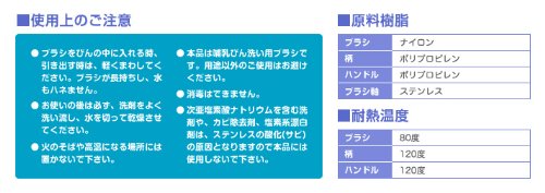 - 材質 : ブラシ:ナイロン(耐熱温度80度)、柄:ポリプロピレン(耐熱温度120度)、ハンドル:ポリプロピレン(耐熱温度120度)、ブラシ軸:ステンレス
