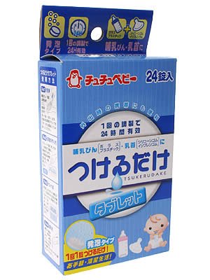 「チュチュベビーつけるだけタブレット 24錠入」は、哺乳瓶や乳首につけるだけの哺乳瓶洗浄です。1回につき、1錠をきれいに洗った乳首や哺乳びん等につけるだけ。発泡するタブレットタイプですので、溶け残りも少なく、混ぜなくても均一になる溶液で清潔にできます。一度調節した液は24時間有効。また、軽量コンパクトのタブレットですので、旅行や長時間お出かけ先に携帯しやすく、使いたい日の日数分だけ持ち歩けるのでとっても便利です。24錠入。 販売元:ジェクス内容量:24錠