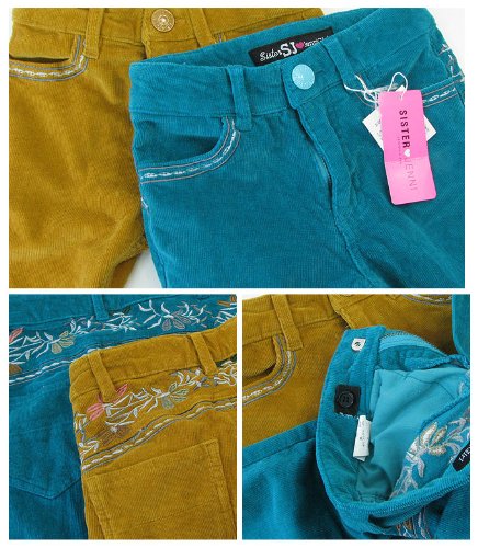 - やわらかな手触りでキレイな発色のコーデュロイ、ぴったり細身のシルエットがキュート、ポケットのフチとヒップの刺繍がポイント