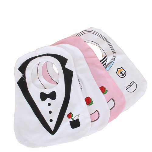 これらのビブピンクに白、ドレスのスタイルで、白、ドレスのスタイルで、白、セーラー服スタイルでキュートなタキシードスタイルでパーソナライズされた、それぞれ付属しています。彼らは、よだれや流出から保護赤ちゃんの服を保つのに役立つ。