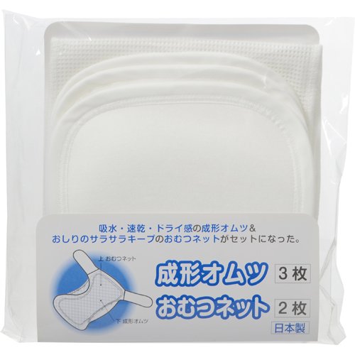 ●商品説明:吸水・速乾・ドライ感のある成形オムツとお尻さらさらキープのおむつネットのセットです。 セット内容:成形オムツ3枚、おむつネット2枚