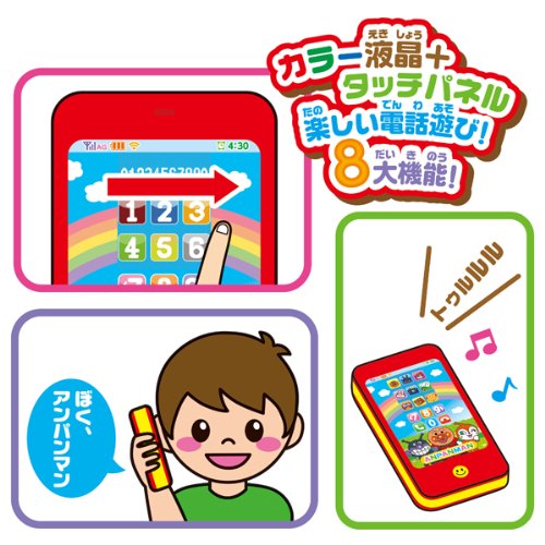 カラー液晶とタッチパネルを搭載!タッチ&スライド操作でかんたんにスマートフォン遊びができるおもちゃです。あいさつや数字の順番などをアンパンマンと楽しく遊びながら覚えられます。2013年日本おもちゃ大賞キャラクター・トイ部門優秀賞受賞!
