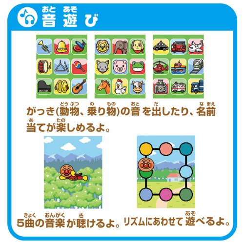 楽器の音、動物の鳴き声、乗り物の音をそれぞれ9種類聞くことができます。また、アンパンマンが出題する音あてクイズを楽しむことができます。聞くことができるメロディは「アンパンマンのマーチ」をはじめ全部で5曲!画面のアンパンマンにあわせてタッチして遊ぶリズムゲームも楽しめます。