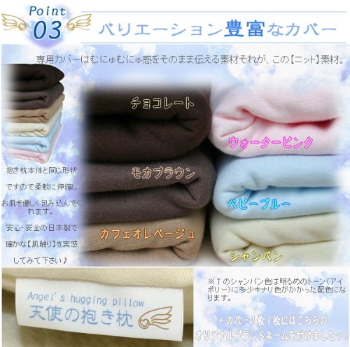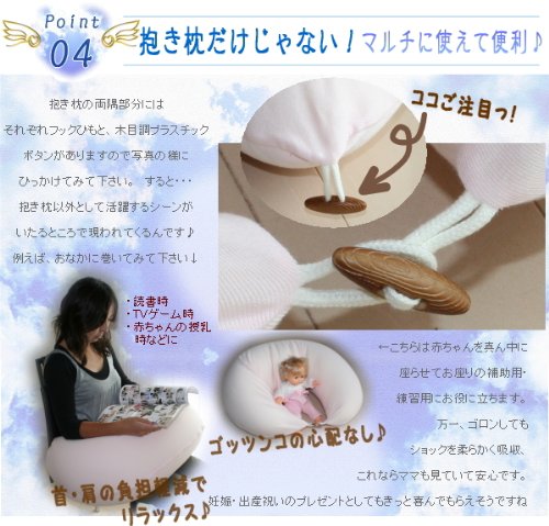 色はライトなカラーから女性に人気のブラウン色まで全6配色カバーからお選びいただけます。さらに、カバーに付随しているストッパーを利用する事で、抱き枕以外として読書時や授乳時、TVゲーム時や時には赤ちゃんのお座り補助用クッションとしても柔らかいからゴッツンコしても怪我をしません。これならママにとっても安心です。他等々様々なシーンに活躍する嬉しい逸品がこの【天使の抱き枕】♪贈り物にもきっと喜んで頂けます。