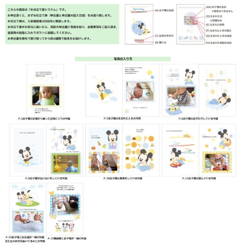ベビーミッキー、ベビーミニーの可愛い挿絵とお子様の写真が入って初めての経験(おすわり・たっち・お食事など)が可愛くつづられます。