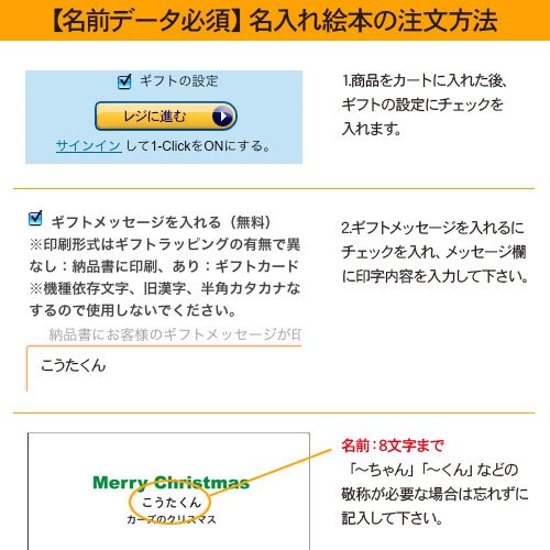 - 印字内容 お話に登場するお子様のお名前(5箇所)8文字まで。「~くん」「~ちゃん」などの敬称が必要な場合は忘れずにお入れ下さい。