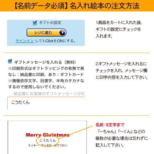 - 印字内容 お話に登場するお子様のお名前(9箇所)8文字まで。「~くん」「~ちゃん」などの敬称が必要な場合は忘れずにお入れ下さい。