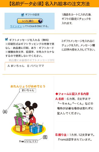 本文中も、ミッキーがお子様の名前をよんで語りかけるので、楽しく絵本の読み聞かせができます。「心温まるプレゼント」と大好評!