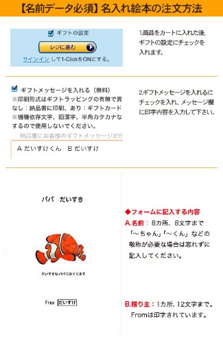 - 印字内容 A:お話に登場するお子様のお名前(8箇所)8文字まで。「~くん」「~ちゃん」などの敬称が必要な場合は忘れずにお入れ下さい。B:贈り主(1箇所)12文字まで。Fromは印字されています。