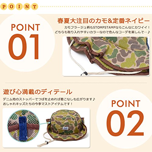 ストンプスタンプ(STOMP STAMP)×リー(LEE)のコラボダブルラッセルハットが登場! ダブルラッセルメッシュ素材を使用した通気性抜群のサマーハットです。 熱がこもって帽子を嫌がるキッズたちでもこのメッシュハットならきっと気に入ってくれるでしょう♪ 探検家のようなおしゃれなシルエットで外遊びにピッタリです! トレンドのカモフラージュ柄と定番のネイビーの2カラー。