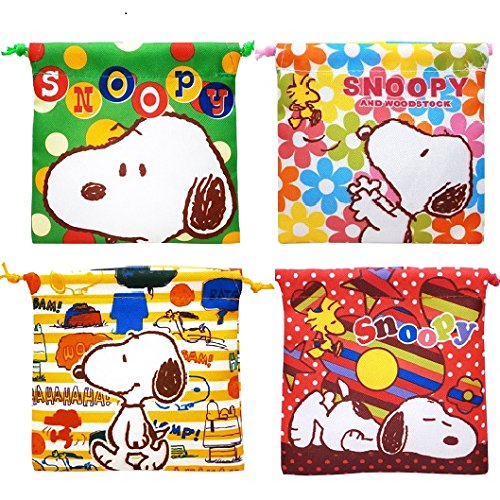 『スヌーピー』のキャラクター巾着です。お子様の給食袋やコップ袋、小物入れとして最適!両面柄入りのスヌーピー巾着袋4枚セット、個包装されていますので、プレゼントにも!