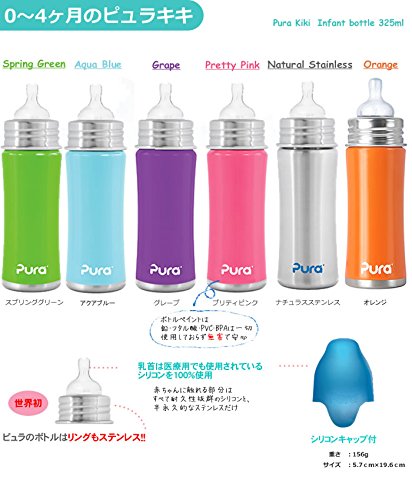 すべての部分に100%プラスチックを使用していないオールステンレスで出来た安心の哺乳瓶&マグです。ボトルペイントも鉛・フタル酸・PVC・BPAは一切使用しておらずプラスチックが気になるママも安心♪●ステンレスメーカーの会社が作ったこだわりのオールステンレスボトルピュラのボトルは食品等級のステンレス鋼として知られている18/8ステンレスから作られており、腐食や染色、抗菌特性への抵抗があります。(牛乳の低温殺菌や多くの市販食品の輸送貯蔵容器で使用されている不活性非浸出材料から作られています)ピュラのボトルの内部表面はサンドブラスト施工により超平滑な表面になっており、開口部は広口で端が汚れがたまりにくい様に丸くなっているため、ボトルブラシでも洗いやすくすべての部品(ボトル、リング、乳首、キャップ)が食洗機使用OK。また、ステンレスの切れ目を外に折り込む事により中に雑菌が溜まることがありません。対象年齢:6ヵ月~付属品:本体・シリコンキャップ・シリコン乳首