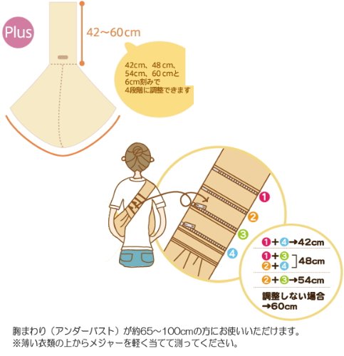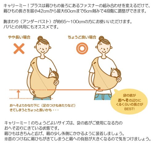- [本体サイズ] 肩ひも : 長さ42~幅60/12cm 袋 : 92/58cm ※胸まわり(アンダーバスト)約65~100cmの方にお使いいただけます。[素材] コットン100% [原産国] 日本国 [適応体重]11.3kgまで