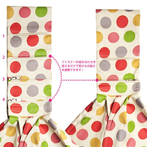 - ほんわかした手書き風のドットがやさしい表情を作り出します。生成り生地に華やかなカラフルドット。少し大人びたローズピンクがアクセントになり、キュートな印象に仕上げています♪元気いっぱいなママにぴったり ! ママのおなかにいた時と同じ姿勢でいられるので赤ちゃんも安心です。抱っこに安定感がありますので、はじめての方にもオススメです !