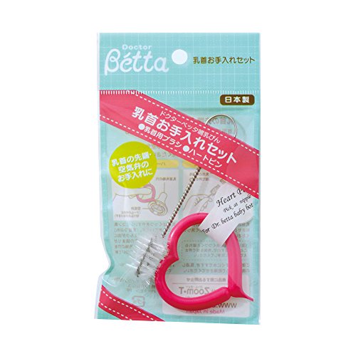 ドクターベッタの乳首をお手入れできるセット! 「通気孔用ハートピン」と「乳首洗い用ブラシ」のセットです。乳首の先端・空気穴のおそうじに。乳首用ブラシは、乳首を傷つけずに洗いにくい乳首の内側まで洗うことができます。また、ハートピンは、乳首の先端の穴や空気弁のおそうじ・お手入れにご使用下さい。お手入れグッズだってベッタは手を抜きません! 「ママがちょっとでも楽しくなるデザイン」を目指しました。 <商品サイズ>・ブラシ:15×20×100mm、・ハートピン:直径50mm <主な素材>・ブラシ:ナイロン100%、柄:ステンレス、・ハートピン:ポリプロピレン