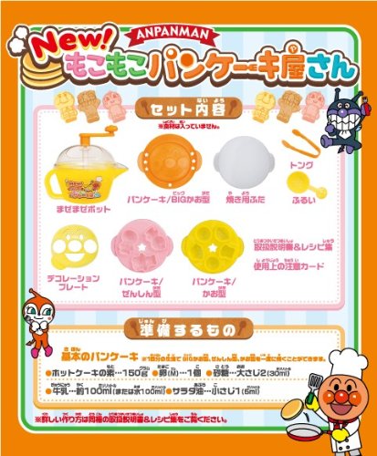 おうちでかんたん♪もこもこアンパンマンパンケーキをつくろう! 思い立ったときにお家にあるホットケーキミックスを使って簡単に、親子一緒にキャラクター型のパンケーキを作れる商品です。作ったあとはトングで挟んで、かわいいお皿に盛り付けて…大好きなパンケーキ屋さん気分が楽しめます。 【リニューアルポイント】 ●レシピを新しく! 大好評のレシピ!更にふわふわ、もこもこの焼き上がりに! おかずのレシピなど美味しくて便利な内容です! ●まぜまぜポットを使いやすく! まぜポットをセットしたまま材料をどんどん入れられるようにフタに穴を開けました!洗い物も減り、より使いやすくなりました! ●大きなパンケーキの型も付きました! 人気のお店みたいな大きなパンケーキも作れちゃう! 【セット内容】 まぜまぜポット、かお型×5キャラ、ぜんしん型×3キャラ、BIGかお型、デコレーションプレート、ふるい、焼き用蓋、トング、レシピ集 パッケージ:330(幅)200(高)170(奥)mm