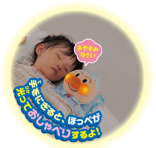 アンパンマンといっしょにおやすみタイム。手をにぎるとほっぺがほんわり光っておしゃべりするよ!