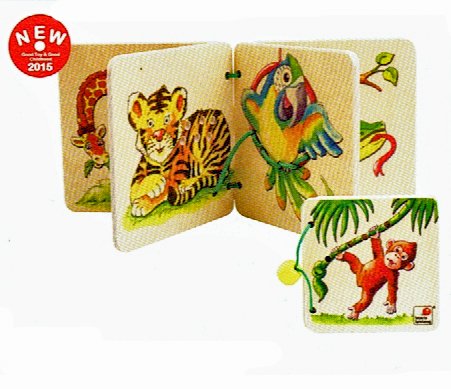 説明 木板の絵本に穴が開いていて、ひも通し遊びが出来ます。ベビーのための木の絵本。