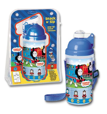 きかんしゃトーマスの、スナックケース付きストローカップです。上はワンタッチで飲めるストロータイプの水筒になっていて、下にスナック入れが付いています。ひねって外します。ストラップ付きで、肩から下げられます。