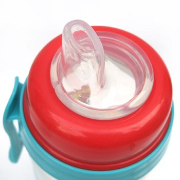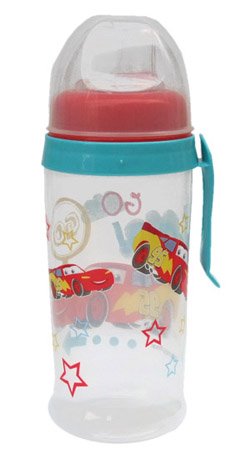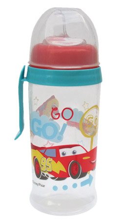 カーズのベビーボトルです。お茶や飲み物の携帯に、カーズのイラストプリントがかわいいです。クリップをポケットなどに掛ければ倒れにくく便利です。容量は約280ml。吸い口はシリコンに切り込みが入っているタイプ。噛みながら吸う力が必要です。