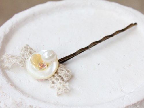 ぼってりとした貝ボタンが とってもいい感じ。ボタンの厚みとコロンとしたパールは存在感があります。飾りの部分は動きますので、左右どちらに向けても リボンが逆さまにならず かわいさキープ♪