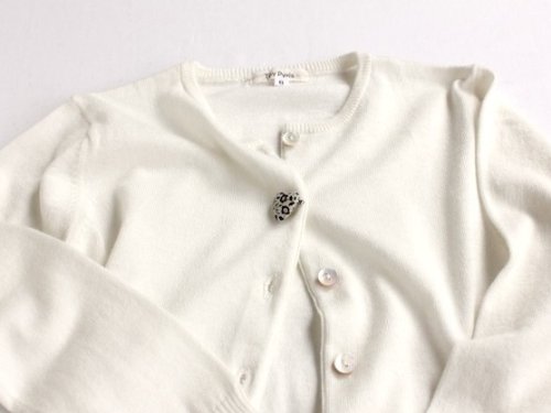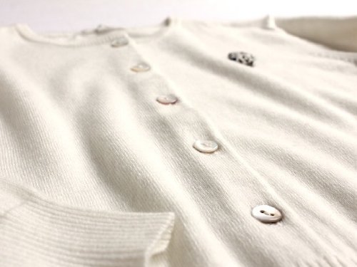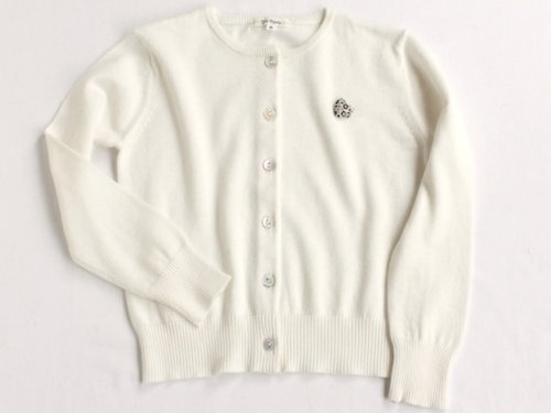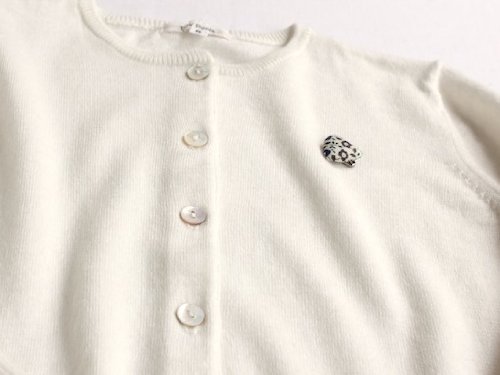やわらかなカシミア混のハイゲージニット。カラフルな貝ボタンがポイントです。ベーシックな丸首カーディガンは、女の子の必須アイテム。オールシーズン活躍します!何だか物足りないっていうときは、付属のリバティプリントのハート形バッジをプラスして どうぞ♪