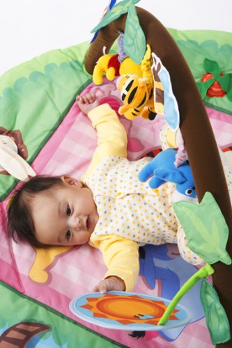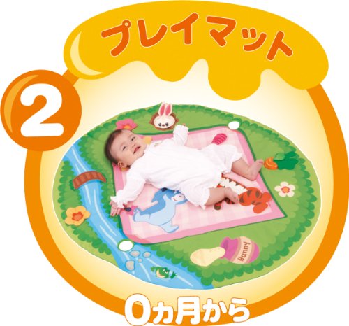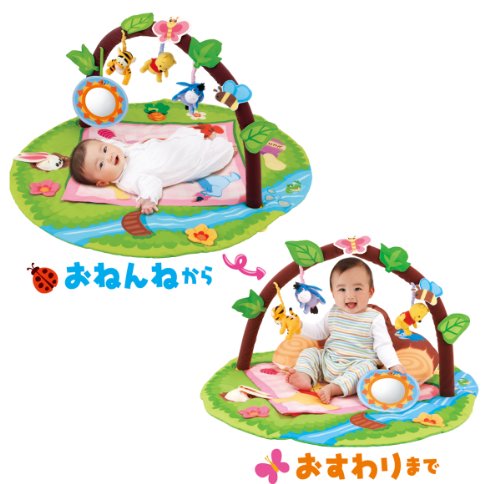 プレイマットに支柱を取り付け、支柱にぬいぐるみやパリパリ入りの葉などを取り付けて赤ちゃんが寝ころびながら遊べる。