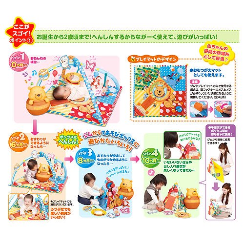 商品説明: 赤ちゃんは生まれてから日中の大半をあお向けで寝た状態で過ごします。 目が覚めてご機嫌な時にお布団からプレイマットに連れていってあげましょう。 赤ちゃんが目の前にある心ひかれたものに手を伸ばし始めたら、 付属するおもちゃを赤ちゃんの目線の手が届きそうな位置に置いてあげましょう。 赤ちゃんは自ら手を伸ばし全身を動かして遊びます。 成長のステップごとに赤ちゃんの発達を促す仕掛けがいっぱい お誕生から2歳頃まで、赤ちゃんの成長を楽しみながら使えるベビージムです。 電池 : 単4形乾電池×2(別売) サイズ: W600×H420×D200mm カラー: くまのプーさん 適応月齢: 0ヶ月~ 原産国: