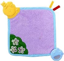 にぎにぎタオルとおもちゃが一緒になっている。正方形のタオル地に歯固め・タグ・パリパリ、ガラガラの4種類の遊びが付いている。