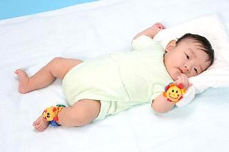 赤ちゃんの手や足に巻きつけて音を鳴らすリストバンド。手足を動かすことで音が鳴るので、聴覚に刺激を与え、運動の手助けをする。鈴とガラガラの2種類の音の違いが楽しめる。手洗いができるので、いつでも清潔。