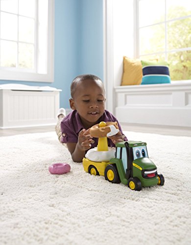 The John Deere Farm Stackers make learning fun for your toddler! When your child stacks the animals correctly he will be rewarded by hearing their sounds! Once all of the animals are stacked up, push Johnny Tractor along and watch the animals spin around on the wagon. The John Deere preschool toys provide classic learning play!