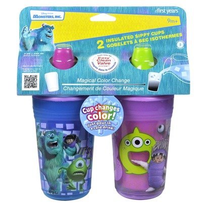 モンスターズ・インクの保冷マグセットです。サリーとマイクとブー、着ぐるみを着たブーのかわいいデザインの2本セット。二重構造で冷たさをキープします。海外仕様のため、かなり吸う力が必要です。冷たい飲み物を入れると色が変わる楽しい仕掛けつき!内容量約266ml 対象年齢9ヶ月以上1つあたりのサイズは約幅8×高さ17.5×奥行8cm